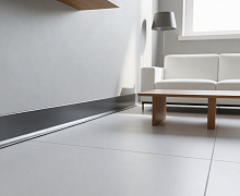 Особенности монтажа: алюминиевый плинтус крепится к стене на жидкие гвозди . Для оформления внутренних и наружных углов используется специальная алюминиевая фурнитура или запил под 45 градусов.
